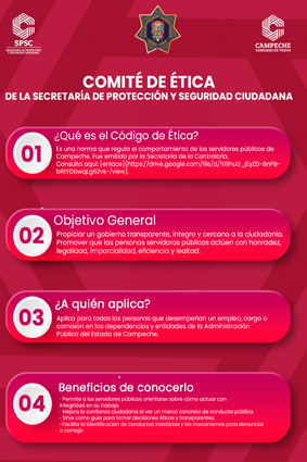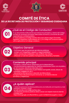 Esta Secretaría, tiene el compromiso y deber que servirá para fortalecer conductas claras, apegadas a derecho, orientadas a fomentar el trabajo honrado, en equipo, conformando bases solidas para lograr un ambiente laboral de respeto, compromiso, honestidad, calidez y desarrollo profesional, consolidando así los diversos valores que caracterizan a la Secretaría de Protección y Seguridad Ciudadana, entre los que destacan la Legalidad, Eficiencia , Profesionalismo y Honradez. Es por eso que se creo el Código de Conducta, con el objetivo de conocerlo y utilizarlo como guía permanente de nuestras acciones, para contribuir a la consolidación de una institución inspirada en la Ética del Servicio Público, Eficaz, Transparente y Responsable.