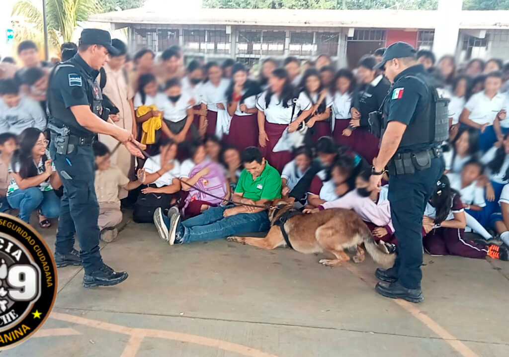 La Secretaría de Protección y Seguridad Ciudadana (SPSC), a través de la Unidad Canina (K9), realizó una demostración operativa y educativa en la Escuela Secundaria General Número 12 de la Junta Municipal de Pomuch, Hecelchakán, con la participación de aproximadamente 500 asistentes entre estudiantes, docentes y padres de familia.